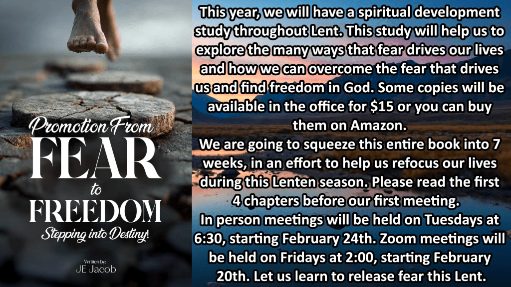 We have a new Spiritual Development Study beginning this coming Friday, February 20th, at 2pm via Zoom and in-person next Tuesday, February 24th, at 6:30pm. For more information, call the church office at 304-327-9727.
